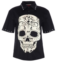 Das lässige Hemd von Jawbreaker hat einen grossen Totenkopfdruck im Frontbereich. Die Ärmel und der Kragen sind mit Pyramidennieten verziert. Das Hemd hat eine Knopfleiste.