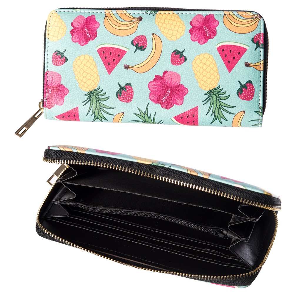 Die Geldbrieftasche ist vorn mit 2 Skelettköpfen und hinten mit 2 Rosen bedruckt. Die Brieftasche ist mit einem Satinband verziert. Sie verfügt über 8 Fächer für Geldkarten, 1 Fach für Kleingeld, 2 Fächer für Scheine.