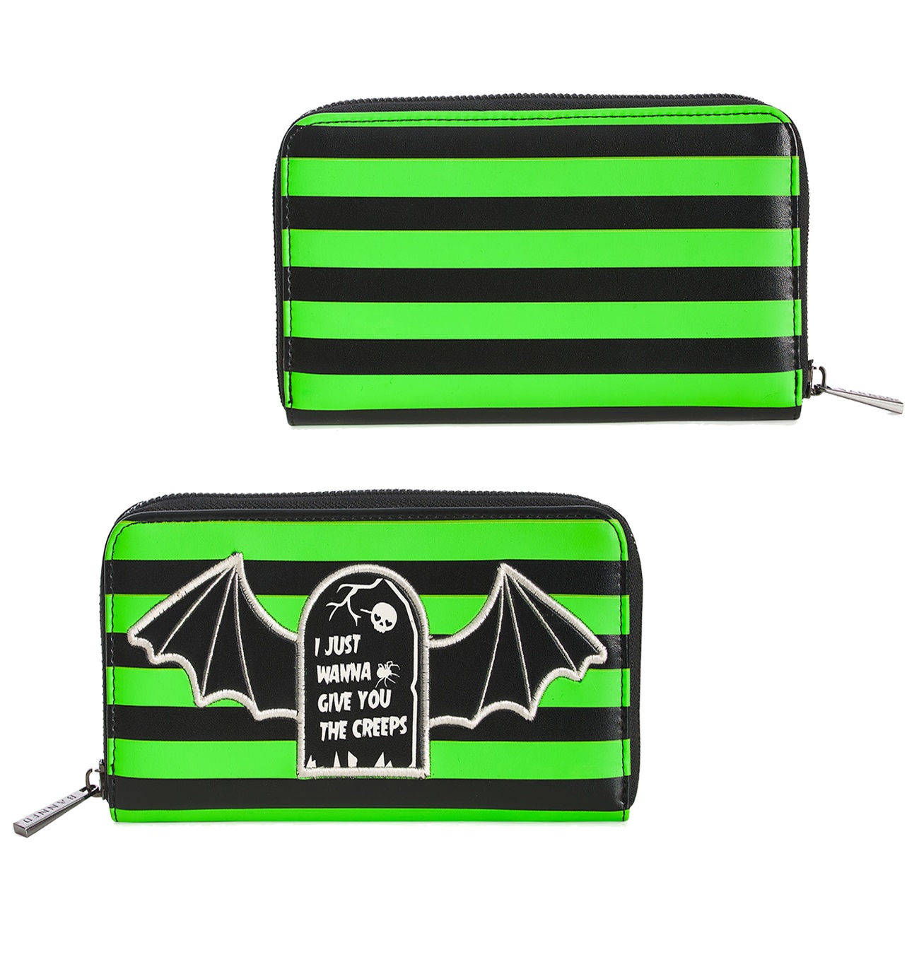 Die Geldbrieftasche ist vorn mit einer Fledermaus und einem Gothicmotiv bestickt, Die Rückseite ist schlicht schwarz. Sie verfügt über 8 Fächer für Geldkarten, 1 Fach für Kleingeld, 2 Fächer für Scheine.