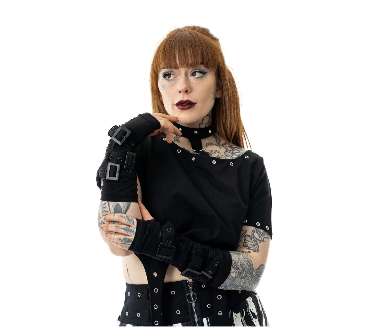 Dehnbare Armstulpen mit Rissen und Netz unterlegt. Darüberliegende Schnallen, sowie Daumenlöcher.