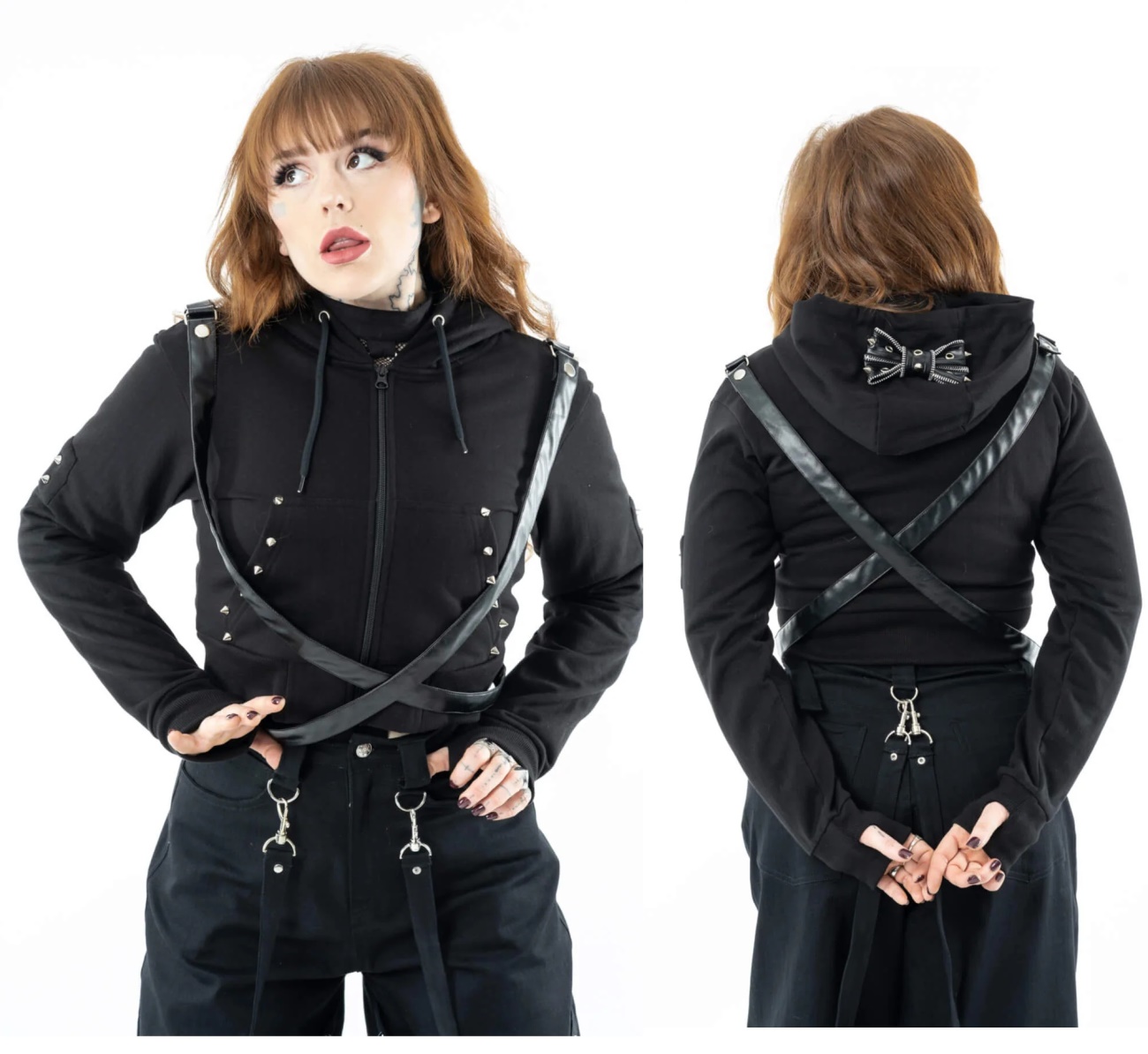 Kurze Sweatjacke, mit Kapuze, abnehmbaren Bändern und abnehmbarer Schleife an der Kapuze. Die Schleife ist mit Nieten und Reißverschluss besetzt und kann aus der Schlaufe entfernt werden.