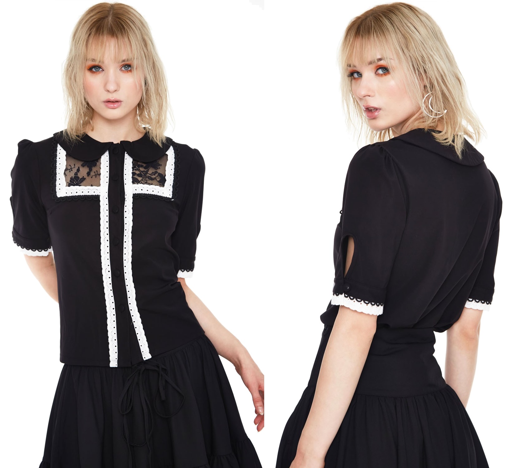 Wednesday Bluse von Jawbreaker mit Bubikragen und floralem Spitzeneinsatz am Dekolleté. Die Knopfleiste, Ärmelenden, sowie Dekolleté sind mit weißer Borte abgesetzt.